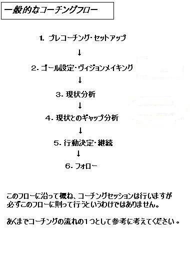 コーチングはコーチングセッションと呼ばれるコーチとクライアントの対話を通じて行います。その対話は、通常のおしゃべりとは違い、コーチングフローと呼ばれるものに沿って概ね、進行します。以下がその流れです。