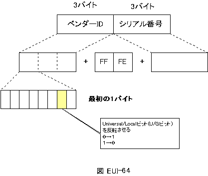 EUI-64は、ホストのMACアドレスをベースにしてインタフェースIDを生成します。MACアドレスは一意なので、MACアドレスを基にしてインタフェースIDを生成すれば、一意なインタフェースIDができるわけです。