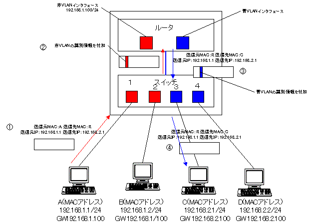 | レイヤ3スイッチによるVLAN間ルーティング 異なるVLAN 次にコンピュータAからコンピュータCというVLAN間の通信を考えます。送信先IPアドレスからコンピュータAは通信相手が異なるネットワークにいると判断し、デフォルトゲートウェイへデータ(フレーム1)を送ります。 スイッチはMACアドレステーブルから、内部トランクを経由して、内部ルータへフレームを転送します。内部トランクを通るときには、赤VLANの識別情報が付加されています。(フレーム2) 内部ルータは、フレームに付加されているVLAN識別情報から赤VLANのフレームであることがわかるので、赤VLANインタフェースで受信してルーティング処理を行います。目的のネットワーク192.168.2.0/24は、直接接続されているネットワークで青VLANに対応していますから、今度は青VLANインタフェースから内部トランクを通して、スイッチに送出していきます。トランクを経由する際には、フレームに青VLANの識別情報を付加して送出します。(フレーム3) このフレームを受信したスイッチは、青VLANのMACアドレステーブルエントリからポート3に転送すればいいことがわかります。ポート3は、通常のアクセスリンクであるためにフレーム4のようにVLAN識別情報を取り除いて、ポート3に流します。コンピュータCはスイッチから無事にフレームを受信することができるようになります。 ![]() データの流れとしては、外部のルータを使った場合と同じで次のようになります。 送信元→スイッチ→内部ルータ→スイッチ→送信元 |