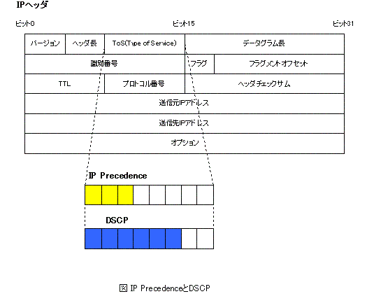 マーキングネットワークデバイスが受信したパケットを分類して、ネットワーク管理者がそれらのパケットをグループ化するプロセスがマーキングです。どのような基準でグループ化するかは、ネットワーク管理者が決めることです。グループ化の基準を明確にするためには、 「QoS(Quality of Service)っていったい何?」 でお話したように、ネットワーク上を流れるアプリケーショントラフィックを調べて、それぞれの優先度を考慮した上でQoSポリシーを作成しておく必要があります。 そして、グループ化した目印をパケットに書き込みます。これが具体的なマーキングになるわけですね。 マーキングするのは、分類のところでもありましたが、パケットのヘッダの次のフィールドにマーキングします。 ・IP Precedence or DSCP ・CoS(Class of Service) ・MPLS Expビット IP Precedence、DSCPはIPヘッダのToS(Type of Service)フィールドの中の情報です。ToSフィールドの上位3ビットを使ってIP Precedenceとしてパケットの優先度を書き込んでいることが多いです。ただ、IP Precedenceでは、8通りの優先度しか定義できないので、IP Precedenceを拡張したものがDSCP(Diffrentiated Service Code Point)です。DSCPは同じToSフィールドの上位6ビットです。IP PrecedenceとDSCPは同じTOSフィールドのどの部分を指しているかによって違うということに注意してください。DSCPはIP Precedenceと互換性が保てるように設定されます。 ![]() (図 IP PrecedenceとDSCP) CoSは、IEEE802.1Q VLANタグの中の3ビットの優先度フィールドです。また、MPLSラベルの中に3ビットのExp(Experimental)ビットがあり、Expビットによってパケットのマーキングを行います。 こうして管理者がパケットをグループ化し、マーキングした結果にしたがって残りのキューイング、スケジューリングのプロセスを制御していきます。 また、分類、マーキングはネットワーク上の各デバイスでその都度行うわけではありません。通常、クライアントコンピュータが存在するネットワークのエッジのデバイスで分類、マーキングをします。そして、エッジ以外の部分ではマーキングした結果に基づいて、キューイング、スケジューリングを行っていくわけです。 |