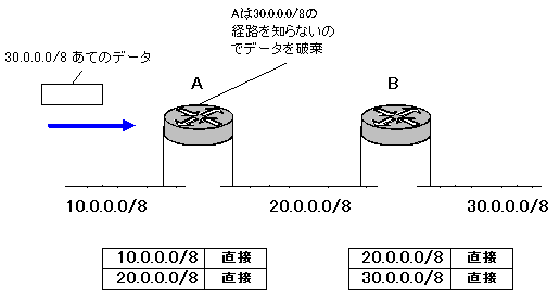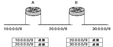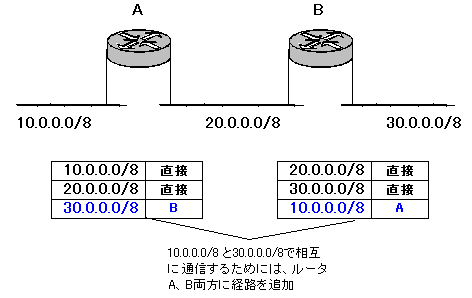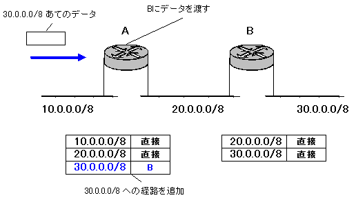 | ルーティングテーブルの設定 下の図のようなネットワークを考えてみます。 ![]() 2台のルータA、Bで 10.0.0.0/8 と 20.0.0.0/8 と 30.0.0.0/8 の3つのネットワークを接続しています。 ルータは、自分が直接つながっているネットワークの情報は知っています。ルータのポートにIPアドレスを設定するとそのネットワークへの経路は自動的にルーティングテーブルに追加されます。 しかし、これ以外のネットワークは知りません。そうすると、困ったことになります。 たとえば、このときルータAに 30.0.0.0/8 あてのデータがやってきたとします。ルータAはルーティングテーブルを見て、どこに送ればいいのかなぁと考えるのですが、その情報はありません。そうすると、ルータはそのデータを捨ててしまいます。ただ、単に捨てるのはあんまりなので、「そのあて先はわかりません」というエラーメッセージを送信元に送り返します。ちなみに、このとき ICMP というプロトコルを使います。 ![]() 30.0.0.0/8 へデータを届けるためには、ネットワーク管理者がそのあて先をルータに教えてあげる必要があります。図で言うと、ルーティングテーブルの青い部分です。30.0.0.0/8 あてのデータはルータBに渡すという情報をルーティングテーブルに追加します。そうすれば、ルータAは 30.0.0.0/8 のデータはルータBに渡します。ルータBにとっては、30.0.0.0/8 のネットワークは自分に直接つながっているので、データを送り届けることができます。 ![]() さらに、ルータBにも 10.0.0.0/8 への経路を登録してあげる必要があります。そうじゃないと「行きはよいよい帰りは怖い」ってな感じで返事が返せなくなってしまいます。pingコマンドなどは、行き帰りができないとエラーになってしまいますね。つまり、スタティックルーティングでは、ネットワーク上のすべての経路について各ルータにその経路を設定してあげなくてはいけません。 ![]() すると、少し考えればスタティックルーティングはとっても大変なん ですね・・・ |
