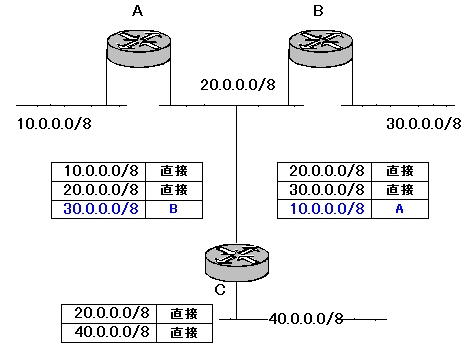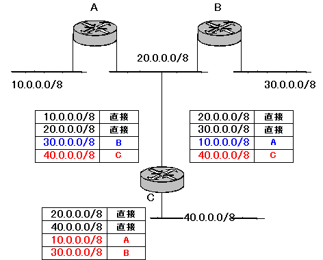 | スタティックルーティングの面倒 このネットワーク環境にあらたにルータCを追加して、40.0.0.0/8 のネットワークを拡張した場合を考えます。 ![]() このときルータA、Bは 40.0.0.0/8 のネットワークへの経路を知りません。同じようにルータCは 10.0.0.0/8 への経路、30.0.0.0/8 への経路を知りません。 ですから、この場合は 10.0.0.0/8 、30.0.0.0/8 、40.0.0.0/8 のネットワークは相互に通信を行うことができないわけですね。 では、通信を行うためにどうすればいいか? ネットワーク管理者がルータA、B、Cに各ネットワークへの経路を教えてあげないといけないわけですね。ルーティングテーブルに各ネットワークへの経路を追加した様子が次の図です。 ![]() いまの例だと、もともとルータ2台のネットワークに1台追加したので、設定を変える必要があるのが合計で3台のルーターになります。 これがもし、10台、20台・・・というようにネットワークの規模が大きくなればなるほど、その設定作業がめんどくさくなるのは、想像できますよね? ルータを追加するだけでなく、たとえば、ネットワークのアドレスが変わったときなどもネットワーク上のすべてのルータの設定の変更が必要になってきます。そうすると、ネットワーク管理者の仕事がルーティングテーブルの書き換えだけで終わってしまうってなことにもなりかねません。 つまり、スタティックルーティングではネットワークの構成の変化に柔軟に対応できないというところがデメリットになるわけですね。 こんなことやってられない、なんとか楽にルーティングテーブルを作る方法がないんだろうか?ということからダイナミックルーティングにうつっていくわけですね。 ダイナミックルーティングでは、ルータ同志で話をさせて、ルーティングテーブルを自動的に作っていくことになります。 |