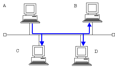 | 媒体アクセス制御方式 実はLANでは、LAN上にあるコンピュータすべてにデータが届く仕組みになっています。 ![]() コンピュータAからコンピュータDにデータを送信するとします。このとき、あて先以外のコンピュータB、Cにもデータが届いています。 小学生のとき、豆電球をつないで電球を光らせるような実験しましたよね?(いまはやってるんでしょうか???)この場合、つながっている豆電球ぜんぶに電流が流れて光ります。それと同じようにLANでは接続されているすべてのコンピュータに電流つまりデータが流れるわけです。 ですから、1台のコンピュータがデータを送信している間は、LANのケーブルを占有していることになります。つまり、同時に複数のコンピュータはデータを送信することができません。もし、複数のコンピュータがデータを送信しようとするとデータ(電気信号)の衝突が起こってしまいます。 そこで、「どの」コンピュータが「いつ」データをケーブルに送信するかということを決める必要があります。これが媒体アクセス制御方式です。 英語では、Media Access Control と呼ばれています。 媒体アクセス制御方式も、LANの規格によっていくつか種類があります。 ・CSMA/CD(Carrier Sense Multiple Access with Collision Detection) イーサネットで使われています。 ・トークンパッシング トークンリング、FDDIで使われています。 ・CSMA/CA(Carrier Sense Multiple Access with Collision Avoidance) 無線LANで使われています。 |