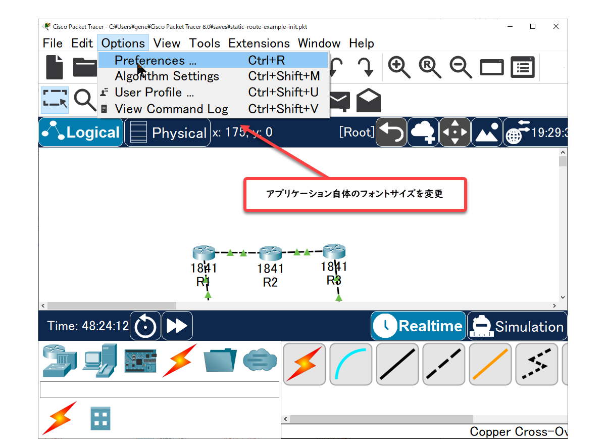Cisco Packet Tracerのデフォルトのフォントは小さくなっています。4Kなど高解像度のディスプレイでは、デフォルトのフォントだととても見づらいです。