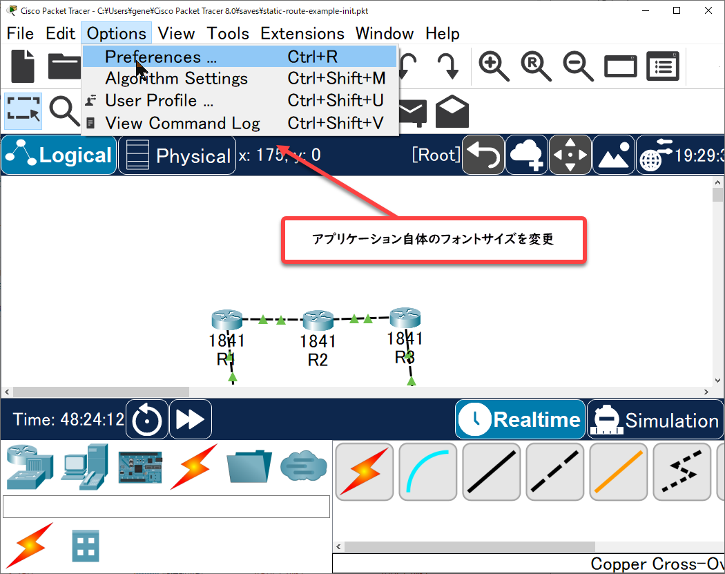 Cisco Packet Tracerのデフォルトのフォントは小さくなっています。4Kなど高解像度のディスプレイでは、デフォルトのフォントだととても見づらいです。