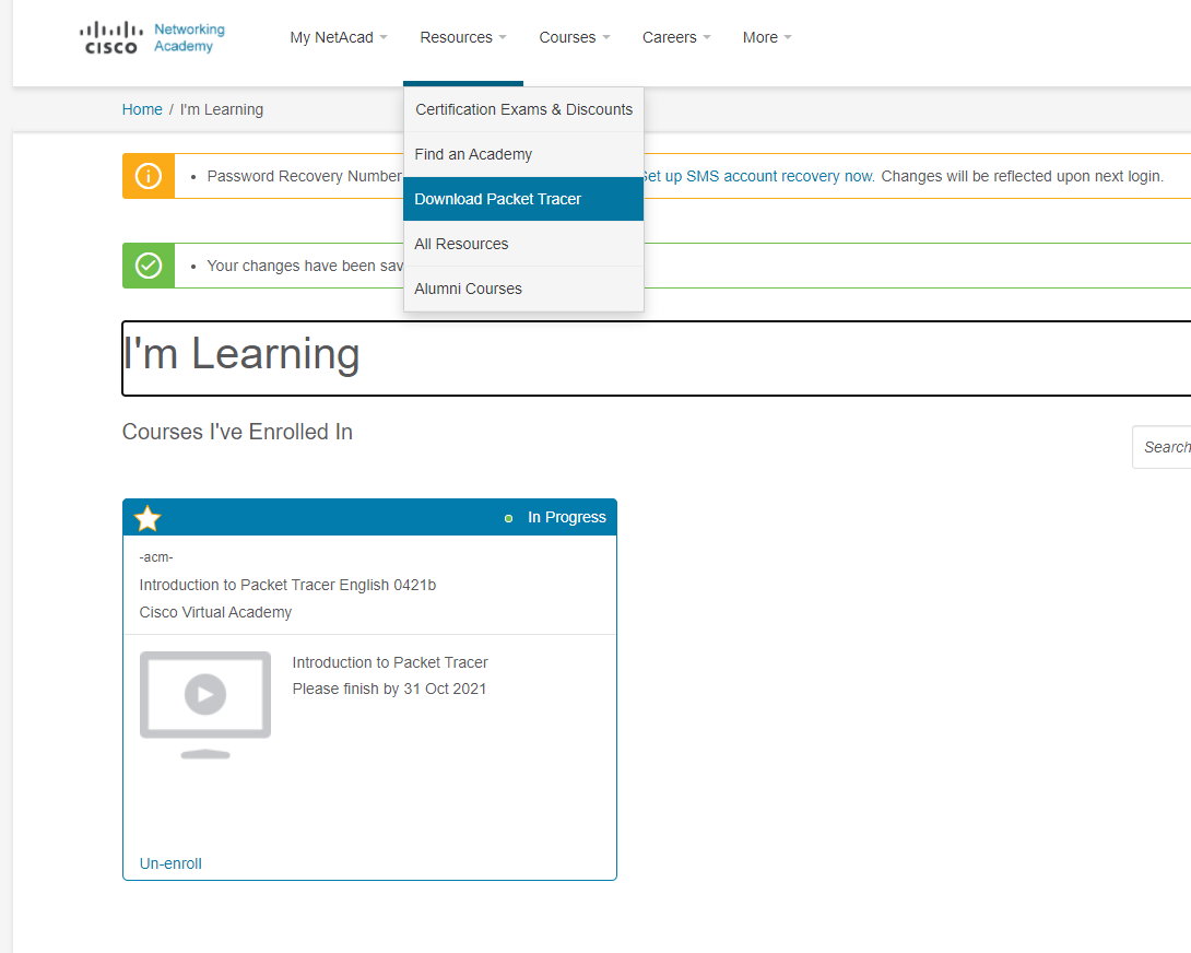 Cisco Packet Tracerのインストーラをダウンロードするには、Cisco Networking Academyの「Introduction to Packet Tracer」のコースに登録します。コースは無料です。