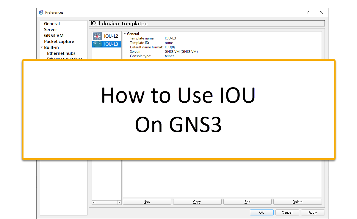 Create a template for IOU devices: open [Edit]->[Preferences] in the GNS3 menu. Select [IOU Devices] and click [New].