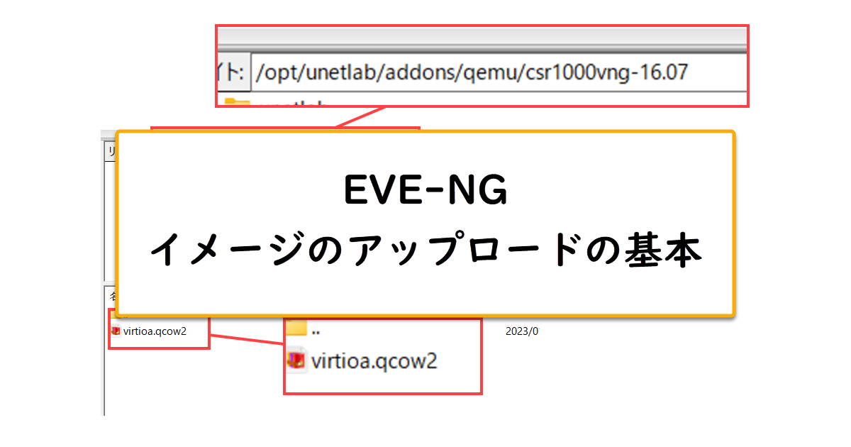 EVE-NGのラボでさまざまな機器をエミュレートするためには、エミュレートしたい機器のイメージファイルをアップロードしなければいけません。EVE-NGへのイメージファイルのアップロードの基本について解説します。