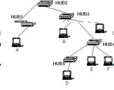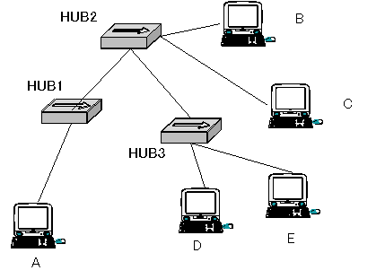 | 10BASE-Tのカスケード 10BASE-Tでは、通信相手との間で経由することができるハブの台数は4台までです。 ![]() 図で、コンピュータAからコンピュータEへの通信を考えます。このときは、 コンピュータA→HUB1→HUB2→HUB3→HUB4→コンピュータE というようにデータが伝わっていきます。間には4台のハブを経由しているので、この場合は制限ぎりぎりですが通信を行うことができます。 しかし、コンピュータAからコンピュータDへの通信では、 コンピュータA→HUB1→HUB2→HUB3→HUB4→HUB5→コンピュータD のように間に5台のハブを経由してしまいます。4台までという制限を越えているのでこの場合はただしく通信できなくなってしまうことがあります。絶対にできないというわけではないのですが、必ず通信できるという保証がなくなります。ネットワークを設計する上では、規格を超えた設計は避けるべきです。 |
