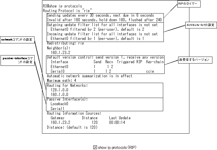 | RIPのタイマー Ciscoルータでルーティングプロトコルの設定を確認するには、show ip protocolsコマンドを使います。RIPの設定を例にとって、show ip protocolsコマンドの読み方をご紹介します。 たとえば、RIPの設定を以下のようにします。 router rip network 128.1.0.0 network 160.1.0.0 passive-interface loopback0 passive-interface serial1 distribute-list 1 in ethernet0 distribute-list 2 out ethernet0 このときのshow ip protocolsコマンドの出力は次のようになります。 ![]() 各ルーティングプロトコルごとに、それぞれコマンド出力は若干異なりますが、大まかな内容は同じです。 そのうち、他のルーティングプロトコルについても紹介します。 |