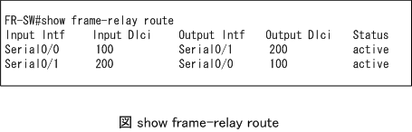 フレームリレースイッチの設定Step1.フレームリレースイッチングの有効化グローバルコンフィグレーションモードで次のコマンドを入力することにより、Ciscoルータをフレームリレースイッチとして動作させることができます。 (config)#frame-relay switching Step2. フレームリレーカプセル化、インタフェースタイプの定義 フレームリレーのDTEを接続するインタフェースにおいて、フレームリレーカプセル化を有効にします。 (config-if)#encapsulation frame-relay そして、スイッチングするインタフェースをフレームリレーDCEとしてインタフェースタイプの定義を行います。 (config-if)#frame-relay intf-type dce Step3. スイッチングする入力DLCIと出力インタフェース、DLCIの対応付け frame-relay routeコマンドにより、スイッチングするインタフェースで、入力DLCIと出力インタフェース、DLCI番号を対応付けます。 (config-if)#frame-relay route [Input-DLCI] [Output-Interface] [Output-DLCI] この例では、FR-SWのSerial0/0インタフェースにDLCI=100で受信したフレームをSerial0/1インタフェースからDLCI=200で送信するので、Serial0/0インタフェースで次のように設定します。 (config)#interface serial 0/0 (config-if)#frame-relay route 100 interface serial0/1 200 そして、逆方向のスイッチングの設定も必要です。Serial0/1でDLCI=200で受信したフレームをSerial0/0からDLCI=100で送信するので、Serial0/1インタフェースで次のように設定します。 (config)#interface serial 0/1 (config-if)#frame-relay route 200 interface serial0/0 100 設定した入力DLCIと出力インタフェース、DLCIとの対応付けはshow frame-relay routeコマンドで確認できます。 ![]() (図 show freme-relay route) |