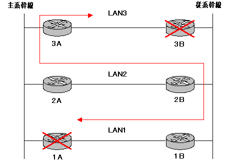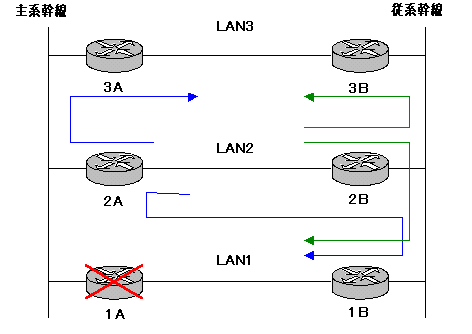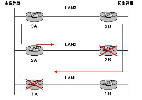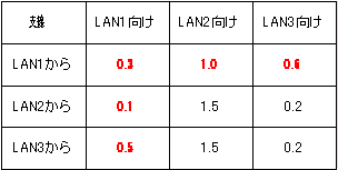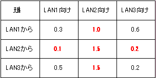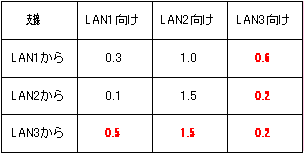 通信ネットワークに関する次の記述を読んで、設問1〜3に答えよ。 S社のネットワークは、LAN1〜3の三つの支線と主系及び二つの幹線から成っている。 支線は通信速度が10Mビット/秒で、パソコン、サーバ、プリンタなど(以下、総称してPCという)が接続されている。幹線は通信速度が100Mビット/秒で、ルータを介して各支線と接続されている。従系幹線は予備であり、通常は主系幹線を使用する(図参照)。 ![]() ルータ同士は経路情報を交換し合っており、それぞれのルータは他のルータから通知される経路情報を常にモニタしている。あるルータからの通知が一定時間以上途切れると、そのルータは故障したものと見なす。 ルータ同士が交換し合う経路情報には、ネットワーク上の距離を数値で表したホップ数が含まれている。ホップ数とは、ある支線から最初にそのルータを経由してほかの支線に到達するまでの間に通過しなければならない最少のルータ数である。この際の通信経路は、一度通った支線又は幹線を再度通ることがないように選ばれる。 ある支線のPCがほかの支線のPCと通信する場合、PCは最少のホップ数で通信できるルータを選択する。そのため、ルータはそのルータに接続している支線のPCに経路情報を通知する。すべてのルータが正常な場合、主系のルータ(1A、2A、3A)だけが経路情報をPCに通知し、従系のルータ(1B、2B、3B)は通知しない。しかし、ほかのルータの故障を検出すると、従系のルータも経路情報を通知し始める。 ルータがPCに通知する経路情報は、”目的の支線名:ホップ数”で表す。例えば、すべてのルータが正常な場合、ルータ1AがLAN1のPCに通知する経路情報は、LAN2:2,LAN3:2になる。 なお、各支線相互間(各支線内も含む)で転送される平均データ量は表1の とおりである。 ![]() [設問1] 次の表は各支線の平均データ量である。(ア)〜(ウ)に入れる適切な数値を答えよ。 ![]() 正解:(ア)2.5Mビット/秒 (イ)4.3Mビット/秒 (ウ)3.0Mビット/秒 解説: これはなんてことない問題ですね。各LANが出すトラフィックと他のLANから入ってくるトラフィックを足していけばいいです。つまり、表1をそれぞれ縦方向と横方向に見ていけば簡単に正解に辿り着くことができるはずです。 つまり、表のそれぞれ赤いところを足していくことになります。 LAN1 ![]() LAN2 ![]() LAN3 ![]() [設問2] 経路情報に関する次の記述中の(エ)〜(キ)に入れる適切な数値を答えよ。 ルータ1Aが故障すると、一定期間後、従系のルータも各支線のPCに経路情報を通知し始める。 このとき、ルータ2AがLAN2のPCに通知する経路情報は、LAN1:(エ)、LAN3:(オ)である。同様に、ルータ2BがLAN2のPCに通知する経路情報は、LAN1:(カ)、LAN3:(キ)である。 正解:(エ)3 (オ)2 (カ)2 (キ)2 解説: 実際に1Aを通らずに行く経路を考えてみれば簡単にわかる問題ですね。ただ、1点注意しなければいけない点は、問題文中に書かれているホップ数の定義です。 問題文にはこうあります。 ”ホップ数とは、ある支線から最初にそのルータを経由してほかの支線に到達するまでの間に通過しなければならない最少のルータ数である” 通知するルータ自身もホップ数に含まれているんですね。ですから、ルータを起点に考えるよりも支線上のPCを起点に考えるといいでしょう。 ルータ1Aが故障のときの経路は次の図のようになります。 ![]() ルータ1Aが故障した場合、LAN2上のPCからルータ2Aを経由するルートは次のように考えられます。 PC(LAN2)〜LAN1 LAN2→ルータ2A→LAN2→ルータ2B→従系幹線→ルータ1B→LAN1 このとき、ホップ数は3です。 PC(LAN2)〜LAN3 LAN2→ルータ2A→主系幹線→ルータ3A→LAN3 ホップ数は2です。 同じように、LAN2上のPCからルータ2Bを経由するルートは、 PC(LAN2)〜LAN1 LAN2→ルータ2B→従系幹線→ルータ1B→LAN1 ホップ数は2です。 PC(LAN2)〜LAN3 LAN2→ルータ2B→従系幹線→ルータ3B→LAN3 ホップ数は2です。 余談ですが、主系のルータがダウンしたら従系のルータが自動的に経路情報を流すなんてルーティングプロトコルあるんでしょうかねぇ・・・?ぼくはそんなルーティングプロトコル聞いたことないです・・・なんとなくRIPっぽいのですが、RIPでそんな制御はできないですよねぇ・・・ [設問3] ルータ1Aと他の一つのルータが故障し、一部の支線でレスポンスが悪化したことがある。次の記述は、このとき発生したレスポンス悪化に関する考察の一部である。 レスポンス悪化に関する次の記述中の(ク)、(ケ)に入れる適切なルータ名と、(コ)に入れる適切な支線の番号を答えよ。 なお、このネットワークは、データ量が支線で5Mビット/秒以上、幹線で40Mビット/秒以上になると、急激にレスポンスが悪化する。 ルータ1Aが故障して、一定期間経過すると、従系のルータも経路情報を支線のPCに送り始め、その結果、従系幹線が利用できるようになる。したがって、ルータ2A、3Aなどの主系のルータが故障しても、従系を利用できるので通信上の問題は発生しない。 ある支線から目的とする別の支線へ通信を行う場合