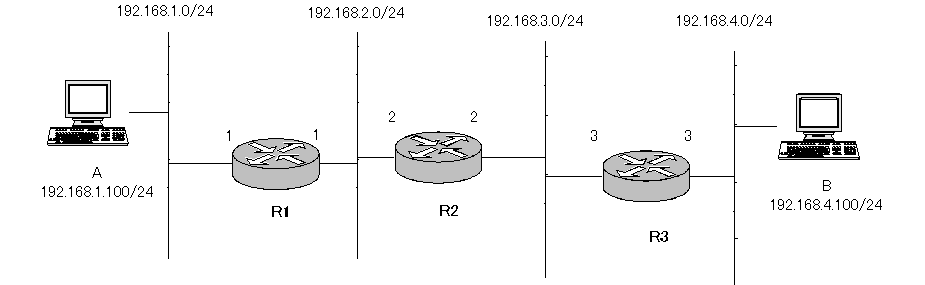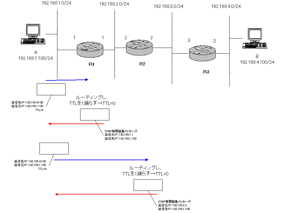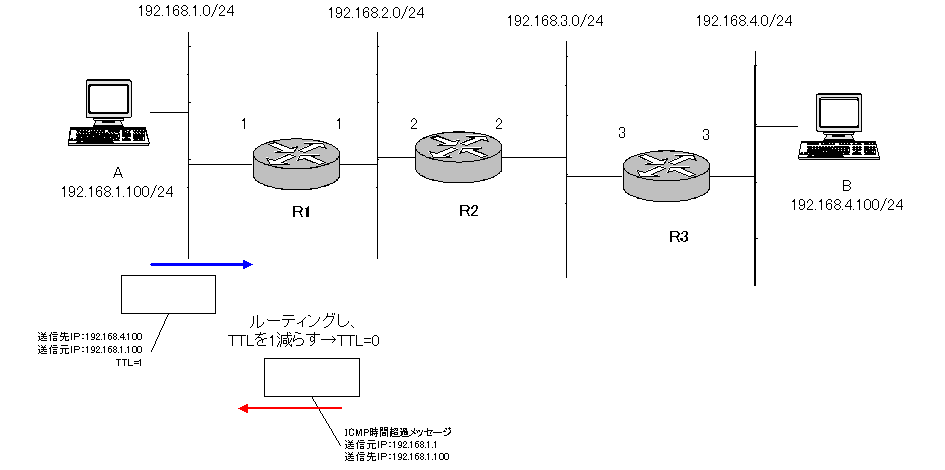 | トレースルート トレースルートにこのICMPタイプ11時間超過メッセージが利用されています。トレースルートとは、目的のIPアドレスまでにどういった経路を通過するのかを確認するためのものです。ルーティングの設定が正しいかどうかを確認することができます。また、データの往復時間もわかるのでネットワークの混雑具合を調べるためにも利用されます。 簡単な例として、次の図のようなネットワークを考えてみます。 ![]() コンピュータAからコンピュータBに行くために、どういう経路(どのルータを経由するのか)を確認します。 まず、コンピュータAはTTL=1として、192.168.4.100(B)にパケットを送ります。R1がこのパケットを受け取ってルーティングをしますが、出力インタフェースに送り出すときに、TTLを1減らします。すると、TTL=0になってしまいますのでパケットは捨てられます。そして、このときR1からコンピュータAに対してICMP時間超過メッセージが送信されます。この時間超過メッセージの中にはR1のIPアドレスが含まれています。 ![]() 今度は、コンピュータAからTTL=2にしてBにパケットを送ります。R1はパケットを受信してルーティングをし、TTLを1減らしてR2に中継します。R2も同様にパケットをルーティングしてTTLを1減らします。すると、ここでTTL=0となるので、パケットは捨てられてしまいます。そしてR2からAに対してICMP時間超過メッセージを送信します。時間超過メッセージにはR2のIPアドレスが含まれます。 ![]() では、次はAはTTL=3にして同様にBにパケットを送ります。これをあて先に到達するまで行うことによって、途中でどのような経路(ルータ)を通っているのかということを確認することができます。 |