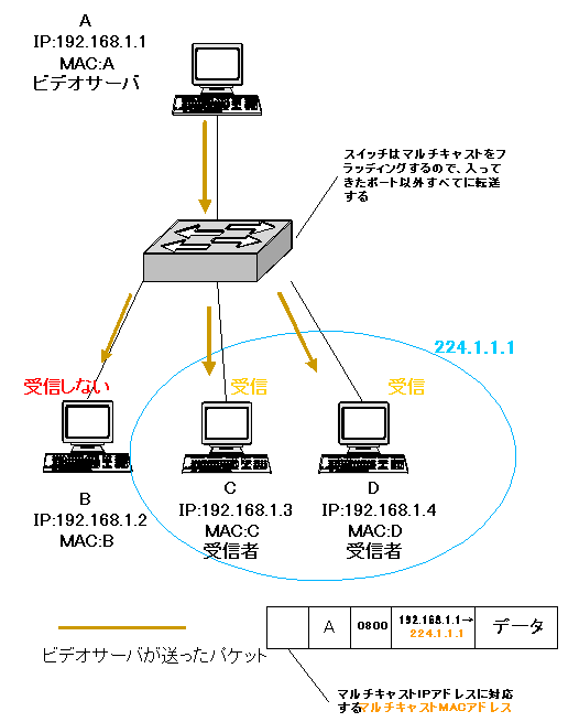 | そもそもフラッディングされる理由は? IGMPスヌーピングで、どうやってマルチキャストのフラッディングを制御するのかということを説明する前に、「そもそもなんでフラッディングされるのか?」ということを説明します。フラッディングされる原因がわかれば、IGMPスヌーピングで何をどうするのかがわかりやすくなります。 レイヤ2スイッチングがUnknownユニキャスト、ブロードキャスト、マルチキャストをフラッディングするのは、ズバリ、「MACアドレステーブルに載せられていないから」です。 スイッチのMACアドレステーブルの登録については、下記のリンクをご覧下さい。 「スイッチ(MACアドレスの学習)」 MACアドレステーブルは、受信したフレームの送信元MACアドレスを登録することによって作っているわけですよね?じゃ、ちょっと考えてみてください。送信元MACアドレスがブロードキャストやマルチキャストになることがあるでしょうか? そうですね、ありえませんよね?送信元MACアドレスは必ずユニキャストのMACアドレスになるはずなのです。 スイッチがフレームを転送するときに、いくらMACアドレステーブルを見てもブロードキャストやマルチキャストのアドレスは見当たらないため、「とにかくあて先がわからないから、全部送っちゃえ〜」という感じで、フラッディングしてしまうわけですね。 ※ただし、ブロードキャストの転送の時には、いちいちMACアドレステーブルを参照していないと思います。この辺は、実際の処理の作りこみの問題ですが、どうやっているかをご存知の方がいらっしゃれば教えてください。 |