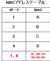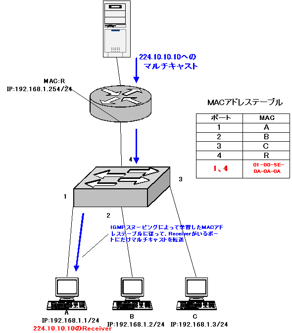 | IGMPスヌーピングの動作 では、具体的なIGMPスヌーピングの動作を考えるために、次の図に沿って解説していきます。図では、すでにスイッチは、MACアドレステーブルを完成させているとします。 ![]() ※SenderとReceiverの間にルータがある場合を考えていますが、SenderとReceiverが同一サブネットにいるときも同じです。 ここで、Aが224.10.10.10というマルチキャストグループのデータを受け取りたいとき、まずIGMP Joinを送信することになります。 ![]() IGMPスヌーピングが有効になっているスイッチでは、IGMPのパケットを受け取ると、その中身を見ます。すると、このIGMPのパケットは、グループに参加するJoinであることと、ポート1に接続されているコンピュータが224.10.10.10というマルチキャストグループに入りたいということがわかります。 スイッチはこのIGMP Joinから、MACアドレステーブルへポート1に01-00-5E-0A-0A-0Aが接続されているというエントリを追加します。 また、ルータはホストからIGMPなどのマルチキャストを受け取る必要があります。そのため、ルータが接続されているポート4にはマルチキャストを転送してあげなくてはいけないので、01-00-5E-0A-0A-0AというMACアドレスをポート4に も登録します。 通常は、MACアドレステーブルには同じ複数のポートに同じMACアドレスが存在することはないのですが、マルチキャストMACアドレスは例外となっています。 「スイッチはルータがつながっているポートかどうかどうやってわかるの?」という疑問をもつかもしれません。これは、ルータしか出すことがないパケットを受信した場合、そのポートをルータが接続されているポートとみなしています。ルータしか出すことがないパケットは、ルーティングプロトコルやIGMPクエリーなどですね。 ※この辺は確実なことはわかりませんが、シスコだったらCDPでやっているのかなぁって思っています。 ![]() このMACアドレステーブルに基づいて、マルチキャストをReceiverがいるポートにだけ送信することができるようになります。 ![]() |
