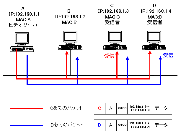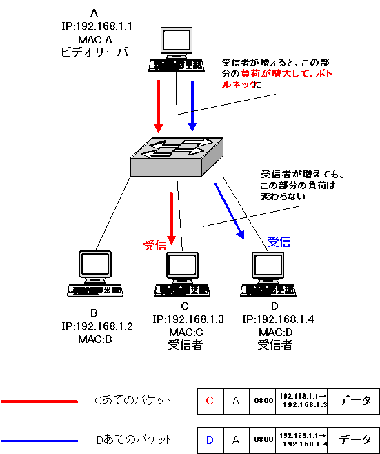 | バス型ネットワークで ユニキャストの場合は、IPパケットをひとつのあて先にしか送ることができません。画像データの中身はまったく同じでも、送信先IPアドレスとして192.168.1.3、192.168.1.4を指定した2つのIPパケットを送らなくてはいけません。 このIPパケットは、IPアドレスに対応付けられるMACアドレスを指定したイーサネットフレームで運ばれることになります。 この例のようなバス型のイーサネットネットワークの場合、イーサネットフレームはすべてのコンピュータに到達します。各コンピュータは、イーサネットフレームの送信先MACアドレスを見て、自分あてのフレームであれば受け取って、IPに渡していき、ここで送信先IPアドレスを見て、さらに上位のプロトコルに渡して、最終的に映像を見ることができるようになります。 図でいうと、赤の線で示されたパケットはコンピュータCが受け取り、青の線で示されたパケットはコンピュータDが受け取ります。 ![]() ユニキャストを利用すると、受信者の数だけパケットを送る必要が出てくるわけですね。そうすると、当たり前のこととして、受信者の数が増えてくると、それだけネットワークに大きな負荷をかけてしまいます。 MPEG2という規格で動画を配信するには、約1.5Mbpsの帯域幅が必要だとされています。 すると、受信者が100人いると、 1.5×100=150Mbps もの帯域幅を消費することになります。もちろん、ネットワーク上は動画だけでなく他のデータも流れているわけですから、受信者が増えれば増えるほど、ユニキャストを利用した複数のあて先へのデータ配信はネットワークにすごく負荷をかけてしまって、他の通信にも影響を与えかねなくなってきます。 |