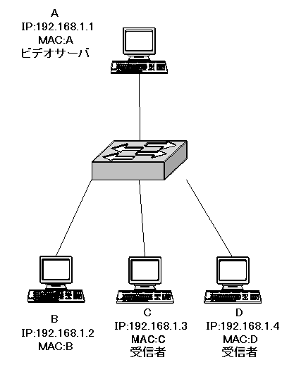 | ユニキャストで複数のあて先に送るとき とっても簡単なネットワークを例に取ります。ひとつのイーサネットのネットワークにA、B、C、Dの4台のコンピュータが接続されています。IPアドレス、MACアドレスは図の中に記載されているとおりです。 Aをビデオサーバとし、画像をCとDに対して配信するという場合を考えます。 ![]() ここで、データ通信のときの階層構造をもう一度意識しておいてください。送信元では、プロトコルの階層構造を上から下にたどって、ヘッダを付加していきます。あて先でデータを受け取ると、プロトコルの階層構造を下から上にたどってヘッダを解釈していきましたね? 忘れてしまったという方は、以下のリンクをもう一度見ておいてください。 |