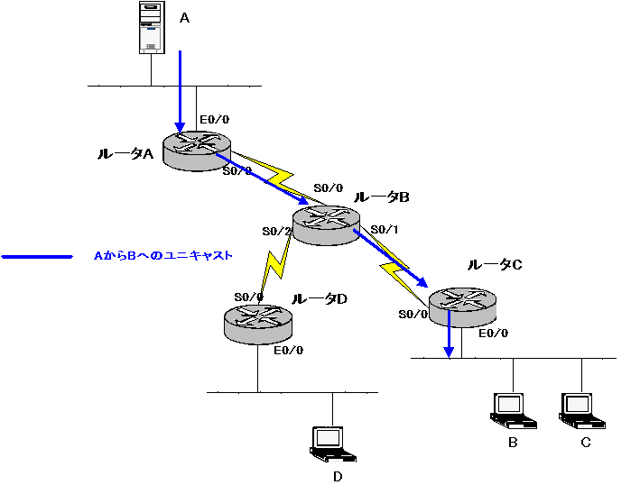 | ユニキャストルーティングでは・・・ マルチキャストルーティングを考える前に、まず、普通のユニキャストルーティングについて振り返ります。 ユニキャストルーティングでは、ルータにやってきたIPパケットの送信先IPアドレスからルータのルーティングテールを参照して、次に転送すべきルータ(ネクストホップ)を決定して、適切なインタフェースからIPパケットを出力します。このとき、当たり前の話なのですが、出力インタフェースは「ひとつ」だけです。 たとえば、次の図でホストAからホストBへとユニキャストの通信を行うとき、その経路上のルータでは、IPパケットを出力するインタフェースはひとつだけですね。ルータAでは「S0/0」インタフェース、ルータBでは「S0/1」インタフェース、ルータCでは「E0/0」インタフェースを出力インタフェースとしてIPパケットの中継を行います。 ![]() ユニキャストは、もともと1対1の通信なわけですから、ルータがユニキャストIPパケットをルーティングするときに出力インタフェースがひとつなのは、すごく当たり前の話です。しかし、これがマルチキャストIPパケットのルーティングでは、話が違ってきます。 |