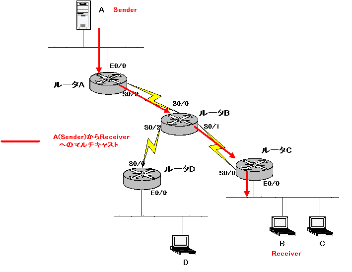 | マルチキャストのルーティングでは・・・ 同じネットワークで、次のようのホストAがSenderでホストBがReceiverだとします。このときの各ルータの出力インタフェースは、さっきのユニキャストの場合と同じく、 ルータAのS0/0→ルータBのS0/1→ルータCのE0/0 になります。 ![]() ここで、新しくホストDもReceiverとなりました。すると、各ルータのマルチキャストIPパケットの出力インタフェースは次のようになります。