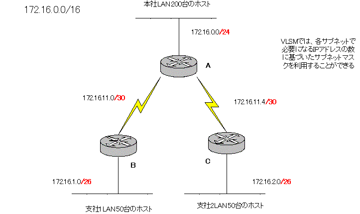 | VLSMによるアドレッシング FLSMによるアドレッシングのIPアドレスの無駄をなくし、効率よくIPアドレスを割り当てるためにVLSMを利用します。次の図がVLSMでIPアドレスの割り当てを行った例です。 ![]() 本社LANでは、前回求めたように、サブネットマスクを/24とすると、200個のIPアドレスをサポートすることができます。支社1LAN、支社2LANの50個のIPアドレスをサポートできるサブネットマスクを求めるには、本社の場合と同様にまず、ホストアドレスをnビットとして、次の式からホストアドレスのビット数を求めます。 2のn乗-2≧50 n=6であるので、サブネットマスクが/26となることがわかります。 本社と支社を接続する専用線のネットワークのサブネットマスクも同様に、ホストアドレスをnビットとすると、 2のn乗-2≧2 より、n=2となり、サブネットマスクが/30であればよいことになります。 FLSMでは、サブネットで共通のサブネットマスクを利用しなければならなかったため、必要とするIPアドレスが最も多いサブネットに合わせなくてはいけませんでした。しかし、VLSMでは各サブネットに必要となるIPアドレスの数に応じて、適切なサブネットマスクを利用することができます。 しかし、ダイナミックルーティングを行う場合、クラスフルルーティングプロトコルではVLSMをサポートしていません。VLSMを利用したい場合には、クラスレスルーティングプロトコルを選択しなければいけないという制限があります。ト |