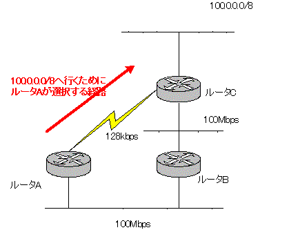 | 単純なホップ数による経路選択の非効率性 RIPはメトリックとして単純なホップ数を採用しています。あて先ネットワークへ到達するための帯域幅や遅延などの項目を経路選択のときに考慮することがありません。そのため、ネットワークの構成によってはRIPによる経路選択は非効率なものになってしまいます。 たとえば、次の図のネットワークを考えます。 ![]() このネットワークにおいて、RIPによるダイナミックルーティングを行っています。このとき、ルータAからルータCに接続されているネットワーク100.0.0.0/8への経路は、ルータCを経由する経路(上の経路)と、ルータBとルータCを経由する経路(下の経路)の2通りあります。 ルータAとルータCの接続はシリアル回線で128kbpsであり、ルータAとルータB、ルータBとルータCは、100MbpsのLANで接続されている場合、下の経路の方が、帯域幅が大きく遅延も少なくなるはずです。 しかし、ルータAはRIPによってルータBから100.0.0.0/8へは1ホップで到達できるという情報を受け取り、ルータCから100.0.0.0/8へ2ホップで到達できるという情報を受け取るので、メトリックの小さい上の経路を採用して、ルーティングテーブル上に追加します。 すると、せっかく帯域幅が大きく遅延も少ない経路があるのにわざわざ非効率な経路を利用するようになってしまいます。つまり、RIPにとってホップ数から判断した最適な経路は、帯域幅や遅延を考慮したネットワークの利用効率からみると必ずしも最適な経路とはなりえません。 ルータでRIPのホップ数を手動で変更して、思うとおりの経路を通るように設定することもできますが、大規模なネットワークではとても大変な作業になります。より適切なルーティングを行いたいというときには、メトリックとしてより正確にネットワークを反映できるOSPFやEIGRPといったルーティングプロトコルを利用する必要があります。 |