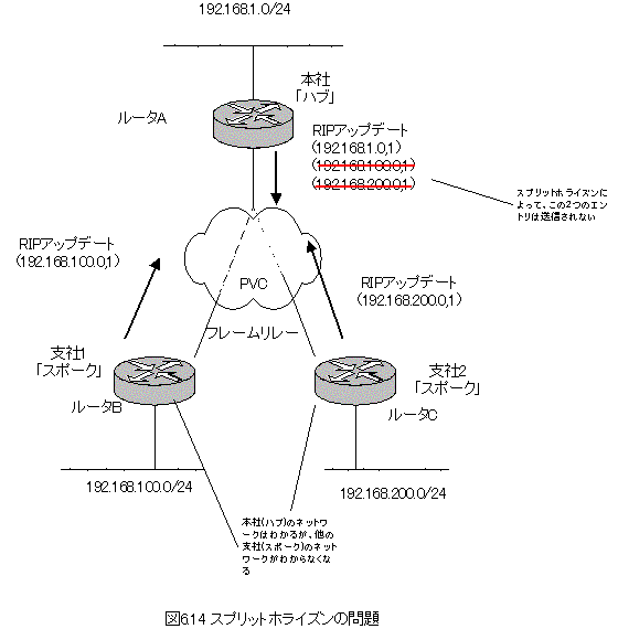 | スプリットホライズンの問題点の解決方法 ハブ&スポークトポロジーにおけるこのようなスプリットホライズン問題を解決するためには、次のような方法が考えられます。 ・ハブルータでスプリットホライズンを無効にする ・ハブルータでPVCごとに論理インタフェースを作成する この問題を解決するためには、スプリットホライズンを無効にすることが、最も簡単な方法だと思います。しかしながら、スプリットホライズンを無効にすることによって、潜在的にルーティングループが発生する可能性があるということを認識しておかなければいけません。 また、スプリットホライズンは、物理インタフェースでも論理インタフェースでも同様に適用されます。そのため、物理インタフェースを複数の論理インタフェースに分割して、ハブとスポーク間のそれぞれのPVCを別々のIPサブネットと対応付けることによって、スプリットホライズンの影響をなくすことができます。ただし、フレームリレーネットワークにおけるIPアドレッシングの変更が必要になります。 |