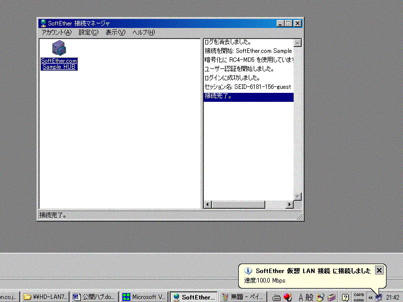 | 匿名仮想HUBへの接続 匿名仮想HUBに接続するのは、とても簡単です。SoftEtherとともにインストールされる「SoftEther接続マネージャ」に匿名仮想HUBに接続するための設定がされたアイコンが用意されています。 ![]() 「SoftEther.com Sample HUB」のアイコンをダブルクリックするだけで匿名仮想HUBに接続することができます。IPアドレスなどの必要な設定は、DHCPによって取得することができるようになります。 ※「DHCPって何?」という方は、下記のURLをご覧ください。 DHCP その1 http://www.n-study.com/network/dhcp1.htm DHCP その2 http://www.n-study.com/network/dhcp2.htm DHCP その3 http://www.n-study.com/network/dhcp3.htm アイコンをダブルクリックすると、接続マネージャの右側のウィンドウに接続のログが表示されます。そして、デスクトップの右下のネットワーク接続のアイコンの部分に、「SoftEther仮想LAN接続に接続しました」と表示されて、仮想LANカードが機能していることが分かります。 ![]() |