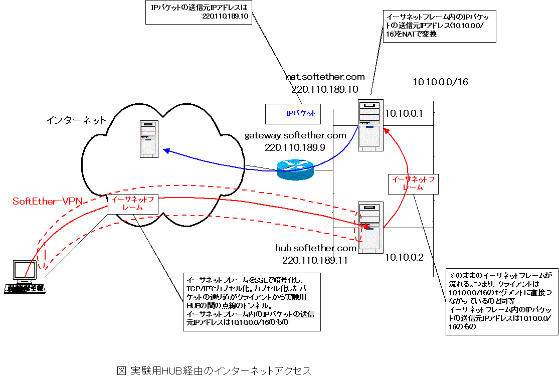 | 実験用匿名仮想HUB インターネット上にSoftEther開発者の登(のぼり)さんが、テスト用にSoftEtherの仮想HUBを「実験用匿名仮想HUB(以下、匿名仮想HUBとします)」として準備されています。自分で仮想HUBを立てなくても、匿名仮想HUBに接続すれば、SoftEtherの接続を試すことができます。さらに、この匿名仮想HUBの仮想的なLANを経由してインターネットへのアクセスができるようになります。 今回は、インターネット上の匿名仮想HUBに接続するまでの様子を見てみましょう。なお、この匿名仮想HUBの情報は、SoftEther公式サイトに載せられています。 「SoftEther.com実験用匿名仮想HUBについて」 http://www.softether.com/jp/hub/ |