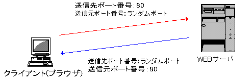 : そして「ランダムポート番号」は1024以上のポート番号でクライアントアプリケーションのポート番号です。サーバからの応答のアプリケーションを識別するためにランダムポート番号を使用します。 実際にブラウザからWEBサーバに対して何かのアクセスをするときにTCPヘッダのポート番号は次のようになります。 ![]() あと実は、「レジスターポート番号」と呼ばれるものもあります。これは正式には登録されていないけど、一般的によく使われるアプリケーションに対するポート番号です。プロキシーの「8080」というポート番号が有名ですね。 以前にルータのときにお話したパケットフィルタリングは、このポート番号を利用して、アプリケーションごとのフィルタリングを行うことができます。また、ファイアウォールもこのポート番号によるフィルタリングの設定を行います。 |