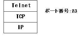 | Telnetの階層構造 TCP/IPプロトコルスタックのアプリケーション層に含まれる代表的なプロトコルとして、Telnetを紹介していきます。 Telnetは、下位のトランスポート層にTCPを利用し、ウェルノウンポート番号として23を使います。 ![]() |