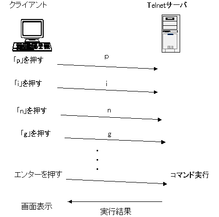 | Telnetのしくみ では、簡単にTelnetの仕組みを見ていきましょう。 まずクライアントからサーバにTelnetすると、TCPスリーウェイハンドシェイクが行われ、コネクションが確立します。もしも、サーバでユーザ認証を求める設定をしていれば、適切なユーザ名、パスワードを入力しないとコネクションが切断されてしまいます。 コネクションが確立されたあと、クライアントからコマンドを送信していきます。その場合、コマンドのまとまりごとに送信するのではなく、キーボードから文字を入力するたびごとにその文字を送信していきます。 ※1文字ずつ送るためにTCPヘッダの中のPUSHフラグが1になっています。 コマンドの文字列をすべて送信し終えて、クライアントでエンターキーを押すとサーバでコマンドが実行されて、実行結果をクライアントに返します。クライアントでは送られてきた送信結果を画面に表示することによって、まるで実際に遠くにあるサーバを操作しているようになります。 ![]() 画面表示に関しては、いろんなコンピュータごとに異なってきます。使える文字コードが違っていたり、特殊なキー(矢印キーやBackspaceなど)をサポートしていたりしていなかったり・・・ このようなサーバとクライアント間でサポートできる機能に違いがあるかもしれないので、調節する必要が出てきます。Telnetでは、IAC(Interpreted AsCommand)という特殊なコマンドによって、サーバとクライアントでサポートしている機能を調節しています。 |