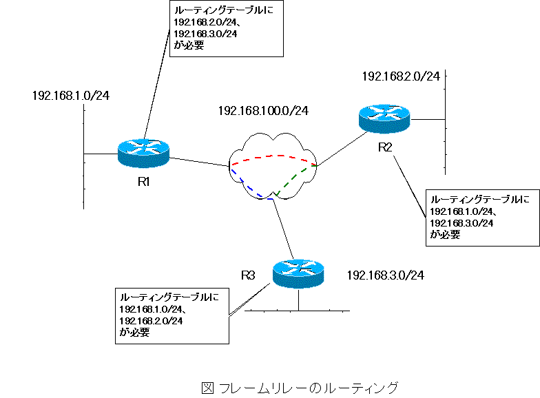 オーバーレイVPNオーバーレイVPNは、共通インフラストラクチャ上でユーザに対して仮想的なポイントツーポイントリンクを提供し、データを転送します。 早い話が、オーバーレイVPNの共通インフラストラクチャでは、ユーザのデータを右から左に流していくだけです。もちろん、他のユーザのデータと混ざらないようにカプセル化してトンネリングしています。 フレームリレーやATMなどのこれまで一般的なWANサービスは、オーバーレイVPNです。キャリアのフレームリレーバックボーンやATMバックボーンでは、ユーザのデータを転送するためのVC(Virtual Circuit)を設定し、VC上で右から左に転送しているだけです。 また、最近普及しつつある広域イーサネットやIPSecによるインターネットVPNもオーバーレイVPNです。 じゃ、次のことをちょっと考えてみてください。 「オーバーレイVPNで、データの転送を判断するのは誰か?」 この答えは、ユーザ自身です。ユーザが自分自身でどこにデータを転送するのかという判断を行う必要があります。つまり、ルーティングの設定はユーザの責任です。たとえば、次のようにフレームリレーで各拠点を接続しているネットワークを考えます。 ![]() (図 フレームリレーでのルーティング) この図のネットワークにおいて、各拠点間のLAN上のコンピュータが相互に通信できるようにするためには、R1、R2、R3のルーティングテーブルに各LANのルートが登録されていなければなりません。 ルートをルーティングテーブルに登録するのは、スタティックルートを設定しても、ルーティングプロトコルを動作してもよいのですが、ユーザのルータ自身がルートをきちんと把握しておかなければいけないのです。 これは、当たり前といえば、当たり前のことです。オーバーレイVPNの共通インフラストラクチャ(この例ではフレームリレーのバックボーン)は、ユーザのネットワークがどこにあるかなんて知らずに、ユーザのデータをカプセル化しているヘッダの情報によって単純にデータを転送するだけです。 でも、 「ユーザ自身がルーティングの設定をする」 のって、ちょっと面倒ですよね? 拠点の数が多かったりサブネットの数が多くなると、スタティックルートを全部設定するのは大変です。 ルーティングプロトコルを使おうにも、フレームリレーやATMといったオーバーレイVPNは、NBMA(Non Broadcast Multi Access)というネットワークのタイプで、普通にイーサネットで設定するよりも追加で設定しなければいけないことがいくつか出てきます。たとえば、RIPやEIGRPなどではフレームリレーのトポロジによっては、スプリットホライズンを考えなくてはいけません。OSPFを使うにはOSPFパケットを通すための設定や、DR(Desginated Router)をどれにするかなどを考えなくてはいけません。 ルートを集約しやすいように、きちんとアドレッシングを考えたりすると、設定を簡単にするための工夫はもちろん可能です。でも、その工夫もなかなか難しかったりします。 そこで、ユーザ自身がルーティングの設定をして、データの転送を判断するのは面倒なので、 「共通インフラストラクチャでルーティングまでやってもらいましょう」 という考えに基づいているのが『ピアツーピアVPN』です。 ピアツーピアVPNでは、共通インフラストラクチャを提供するキャリアがユーザのルーティングに参加し、最適なデータの転送を行うというメリットがあります。 |