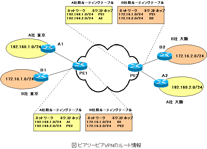ピアツーピアVPNでのデータの転送ピアツーピアVPNのバックボーンは、ルータなどのIPを認識するデバイスで構成されています。ユーザの拠点のルータは、サービスプロバイダのルータに接続される形になります。サービスプロバイダのルータは、ユーザの拠点の中のサブネットのルート情報をすべてルーティングテーブルに持っています。もし、複数のユーザを収容しているのであれば、ユーザごとに個別のルーティングテーブルを作成します。 ユーザの各拠点のルート情報は、サービスプロバイダのバックボーンを通じて配布されます。その結果、ピアツーピアVPNを構成するルータは、各ユーザのルート情報をすべて把握していることになります。 たとえば、次の図のようにA社、B社という2社のユーザがあるサービスプロバイダのピアツーピアVPNのサービスを利用して東京本社と大阪支社を接続している例を考えます。 サービスプロバイダのルータであるPE1、PE2はA社、B社それぞれ専用のルーティングテーブルを構築し、ユーザのルート情報をすべて把握しています。 東京のPE1のA社用のルーティングテーブルを見てみると、192.168.1.0/24というルートはネクストホップがA1であり、192.168.2.0/24というルートはネクストホップがPE2で登録されています。B社用のルーティングテーブルにもB社のルート情報がすべて登録されています。PE2でも同様にユーザのすべての拠点のルート情報が登録されています。 あと、図には記していませんが記していませんが、PE1やPE2のサービスプロバイダのルータは、バックボーンのルートを登録したルーティングテーブルもあります。つまり、サービスプロバイダのルータは、 ユーザごとのルーティングテーブル+バックボーンのルーティングテーブル の複数のルーティングテーブルを持つことになります。 ![]() (図 ピアツーピアVPNのルート情報) オーバーレイVPNでは、ユーザの拠点のルータが自らの拠点のルート情報を保持し、ルーティングの判断を行っていました。でも、ピアツーピアVPNは、サービスプロバイダのルータがユーザのルート情報を保持しているので、ルーティングの判断はとても簡単です。ユーザのルータの拠点以外のあて先に対しては、サービスプロバイダのルータに送ってしまえばいいだけなんです。 たとえば、A社の東京本社から大阪支社の192.168.2.0/24へのデータは、あて先が東京本社のルートじゃないので、A1ルータはPE1へデータをルーティングします。そして、PE1がA社用のルーティングテーブルを見てPE2へ転送します。PE2でもA社用のルーティングテーブルを見てA2へ転送するという具合です。 ![]() (図 ピアツーピアVPNのルーティング) A1やA2などのユーザの拠点のルータには、自分の拠点以外のデータをサービスプロバイダのルータに転送するためのデフォルトルートだけあればルーティングの設定ができてしまうことになります。 オーバーレイVPNに比べて、ユーザのルーティングの設定がとても楽になることがよくわかりますね。 こうしたピアツーピアVPNの代表的な例が実は、 「IP-VPN」 なのです。 つまり、IP-VPNを利用するとユーザにとってはルーティングの設定をとても楽にすることができます。 次回、IP-VPNについて解説したいと思います。お楽しみに!! |