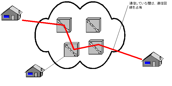 | 回線交換型 回線交換型は、送信元から送信先への特定の経路をあらかじめ確保してから通信を開始する方式です。たとえば、電話網やISDN網は回線交換型の例です。 ![]() 回線交換型は、確保している通信回線上に割り込んで通信を行うことができません。いま電話で話している人に電話をかけても、話中で通信ができないのを思い浮かべればいいでしょう。そして、通信をしている間、必ず回線を確保するので、料金は回線を確保している「時間」によって決まります。 という性質から、回線交換型はいつでも通信を行いたいというときにはあまり向きません。どちらかというと、散発的な通信が必要なときに回線交換型のWAN接続を利用します。 |