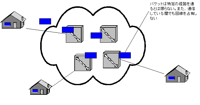 | パケット交換型 パケット交換型は、データを「パケット」と呼ばれる小さな単位に分割して送信します。パケットには、送信先の情報を書いているヘッダがつけられ、ネットワーク上に送られますが、回線交換型のように特定の経路を通るわけではありません。パケットによって、あて先までの経路が異なるかもしれません。 ![]() パケットが特定の経路を通らないということは、そのネットワークを複数のデータで共有できるということを意味しています。そのため、回線交換型よりもサービスを提供するコストを安くできる可能性がたくさんあります。 パケット交換型のコストは、送信した「データの量」に従って課金する方法や常時接続の形態で月額固定料金を支払うことがあります。 パケット交換型のWANサービスの例として、 ・フレームリレー ・ATM などがあげられます。 |