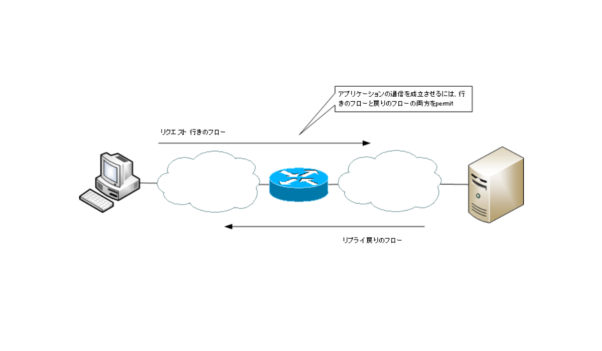通信は双方向で何らかのリクエスト(行きのフロー)に対してリプライ(戻りのフロー)が返ってきます。アプリケーションの通信を成立させるためには、当然ながら、行きと戻りの両方のフローがpermitされるようにしなければいけません。