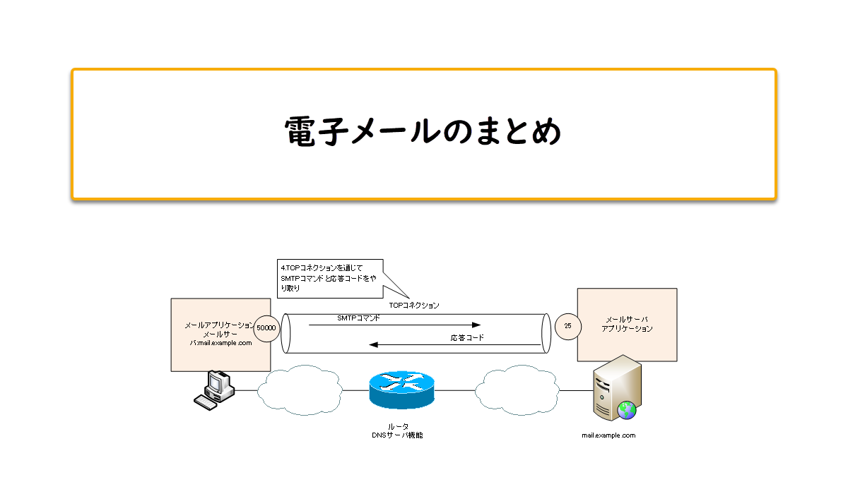 メールサーバのIPアドレスを解決したら、メールアプリケーションとメールサーバアプリケーション間でTCPコネクションを確立します。メールサーバアプリケーションのポート番号はウェルノウンポートの25です。