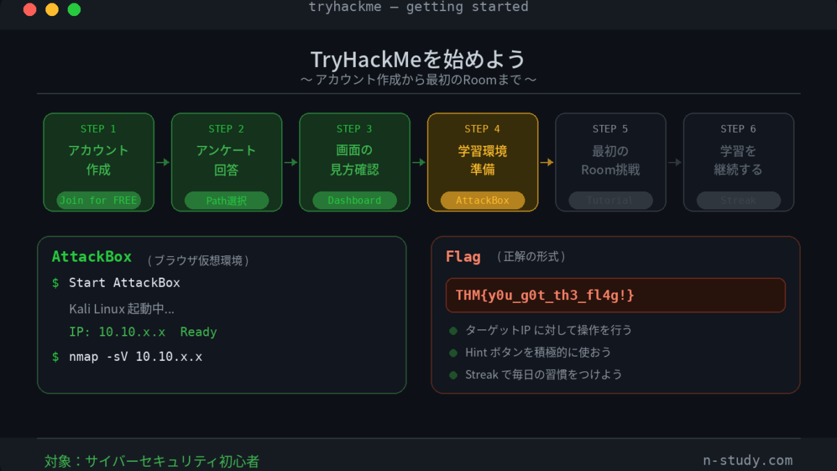初心者はまずAttackBoxから始めることを強くおすすめします。環境構築で詰まることなく、すぐに学習に集中できます。