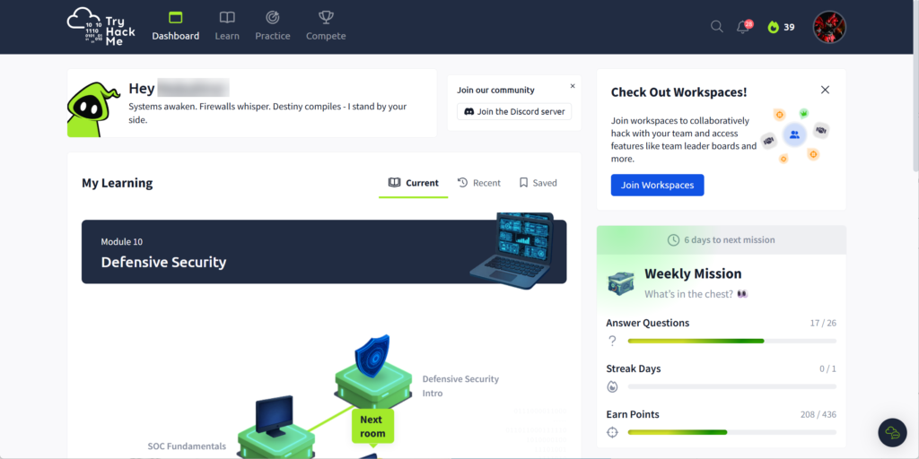 TryHackMeでは毎日ログインすることで「Streak(ストリーク)」が記録されます。連続ログイン日数がダッシュボードに表示されるため、毎日少しでもアクセスする習慣が自然とつきます。